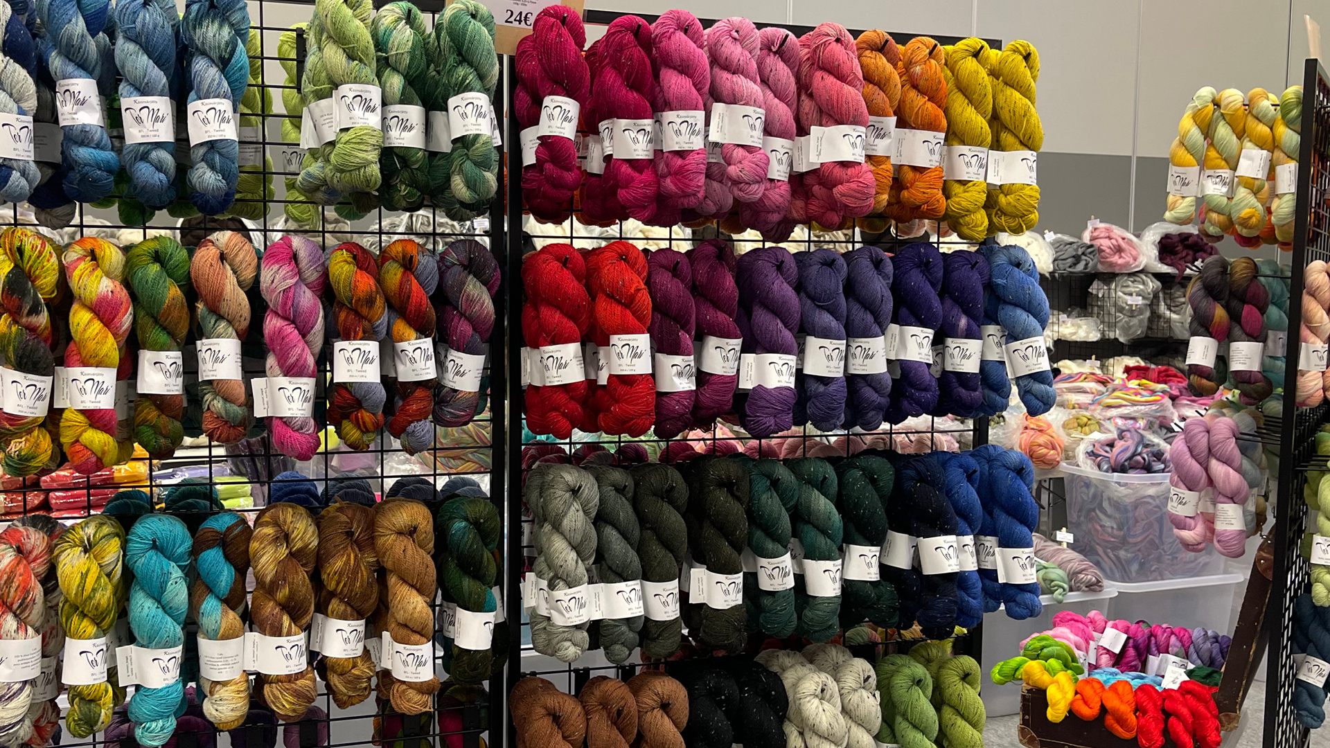 Kuutisenkymmentä eri lammasrotua luonnollisine värivariaatioineen naturelleina kampatopseina, hurjan määrän yksivärisiä, värisekoituksia ja eri rotujen yhteen kammattuja villoja, lisääntyvä määrä hurmaavia, yksilöllisiä sekoituksia, jotka ovat syntyneet ajatuksissani pitkän pohdinnan ja kuituvertailujen pohjalta edeten suunnitelmiksi ja lopulta kampautettu kehräämöllä asiakkaideni iloksi, ylellisiä silkki-villoja, hämmästyttäviä kasvikuituja ja tietysti Marin hellyydellä ja taidolla käsin värjäämiä uniikkeja kampatopseja.