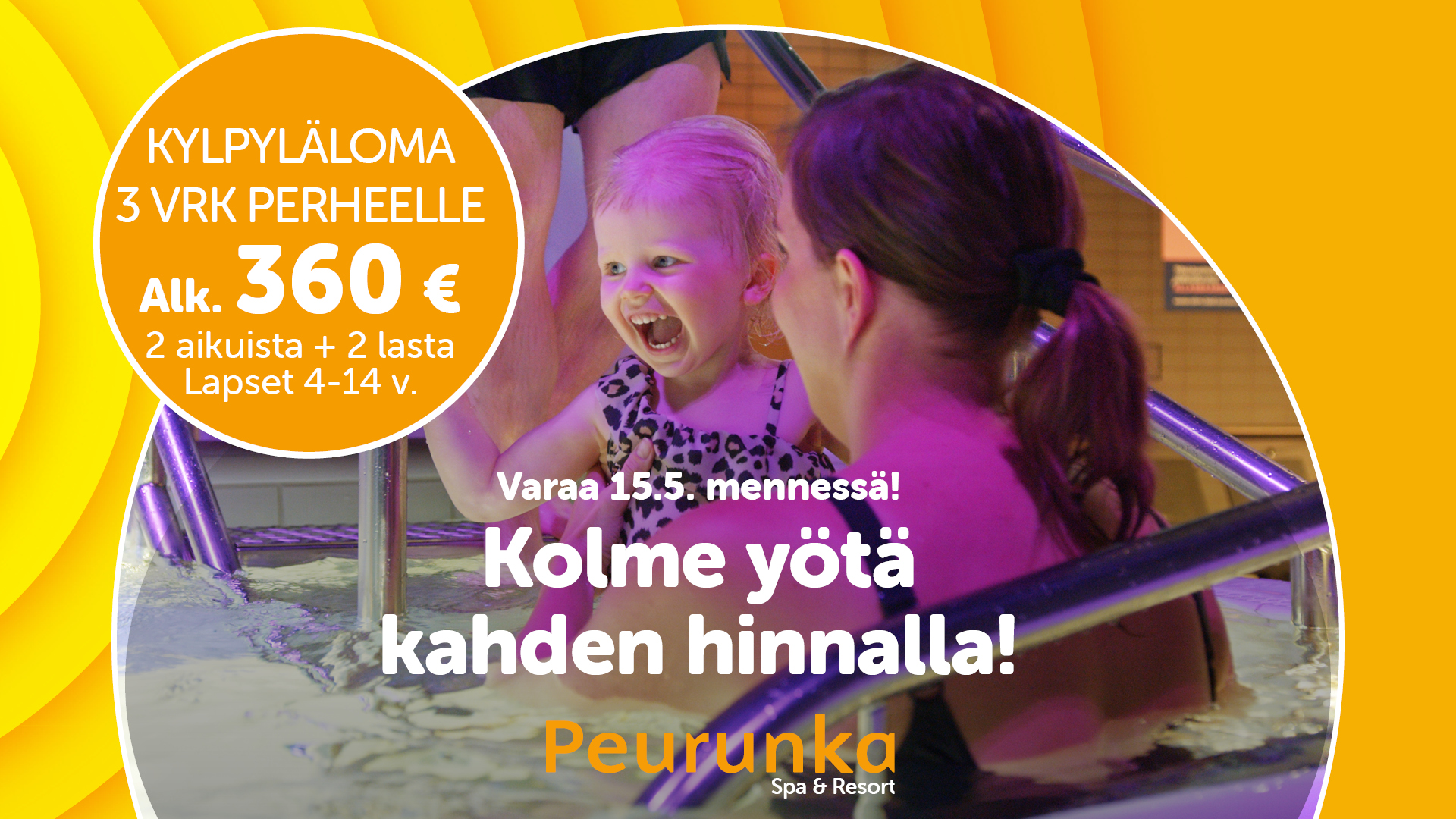 - Tarjous on voimassa Kylpylähotelliin, Peurunkapihaan ja hostelli Peurunkamäkeen.